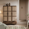 - Generous storage meets timeless elegance in the Izzy Curved Rattan Triple Closet in Walnut.