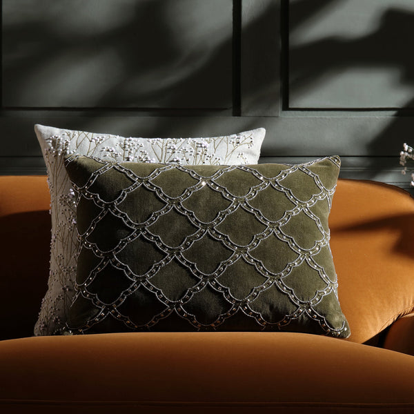 - The Greta pillow is made from sumptuous moss green pure cotton velvet and beautifully adorned with silver metallic beads, this cushion is the perfect solution for Glam décor.