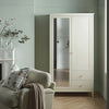 - The mirrored door opens to reveal one hanging rail, while the other compartment includes its own hanging rail and sits above the drawers, providing a well-balanced combination of concealed storage options.