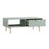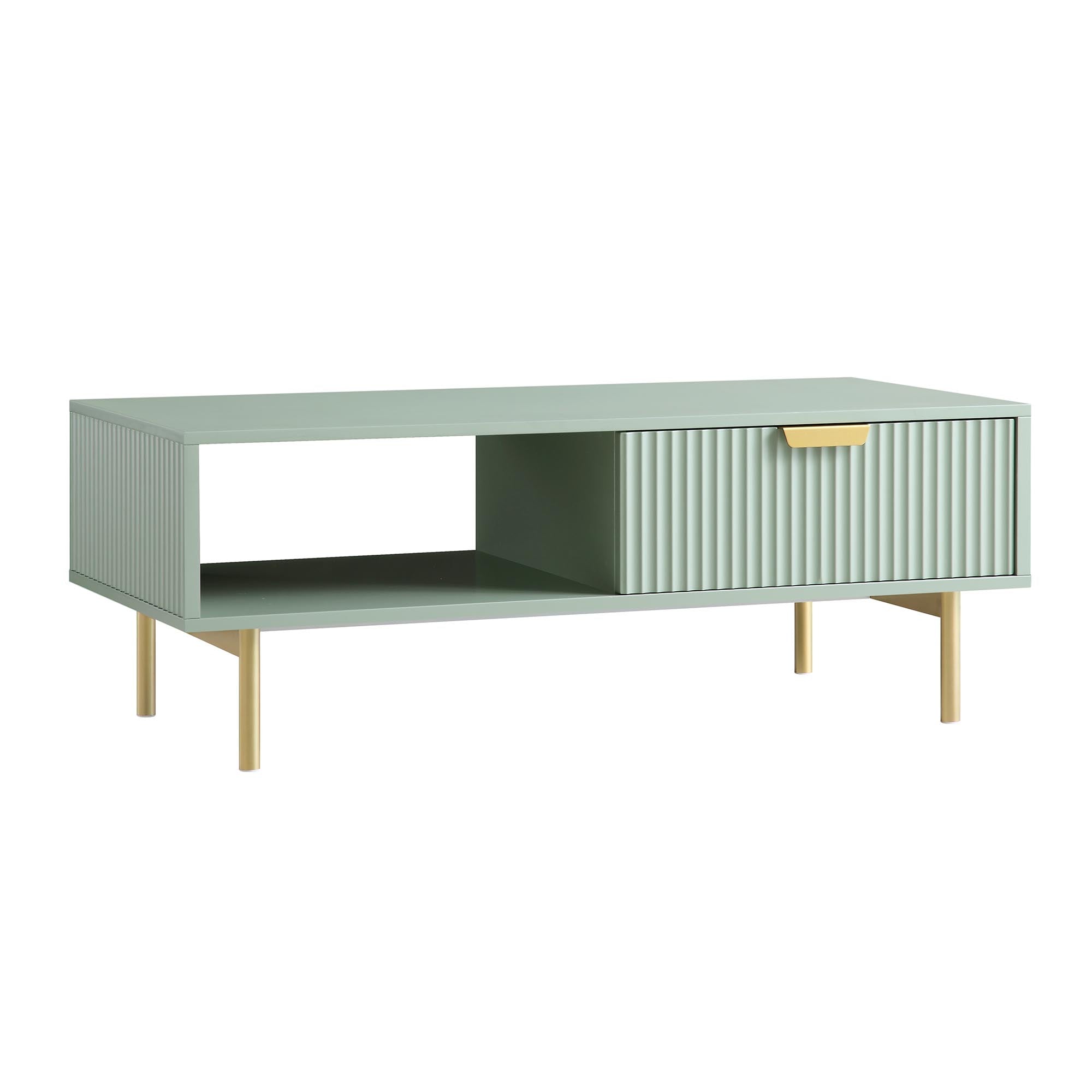 - With a ridged finished in matte sage green paint, the coffee table is further enhanced by the gold drawer handle and legs.