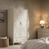 - The double closet opens up to ample hanging space inside, as well as two bottom drawers for smaller items.