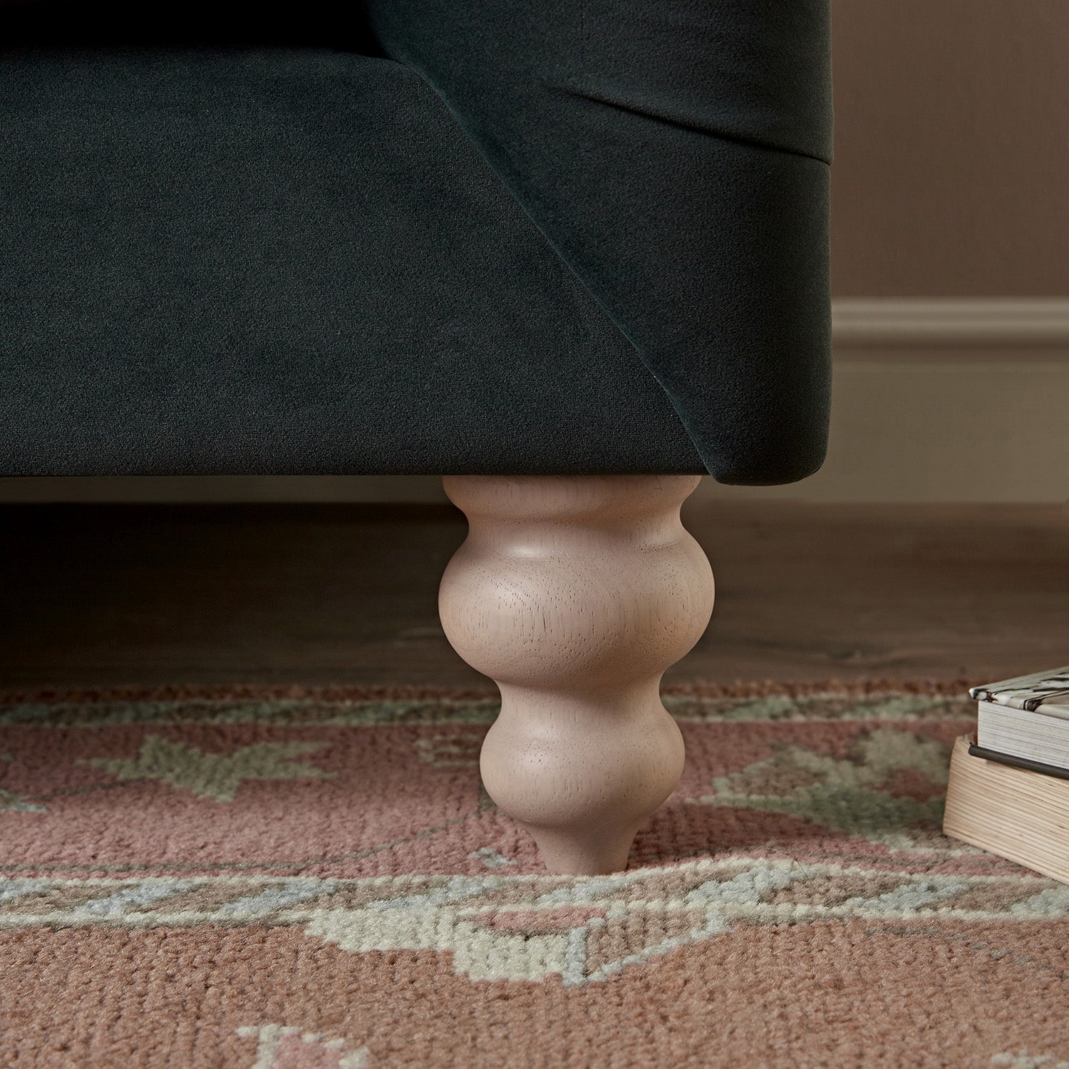 • Slightly distressed, turned solid wood legs complement the beautiful neutral appeal of the sofa.