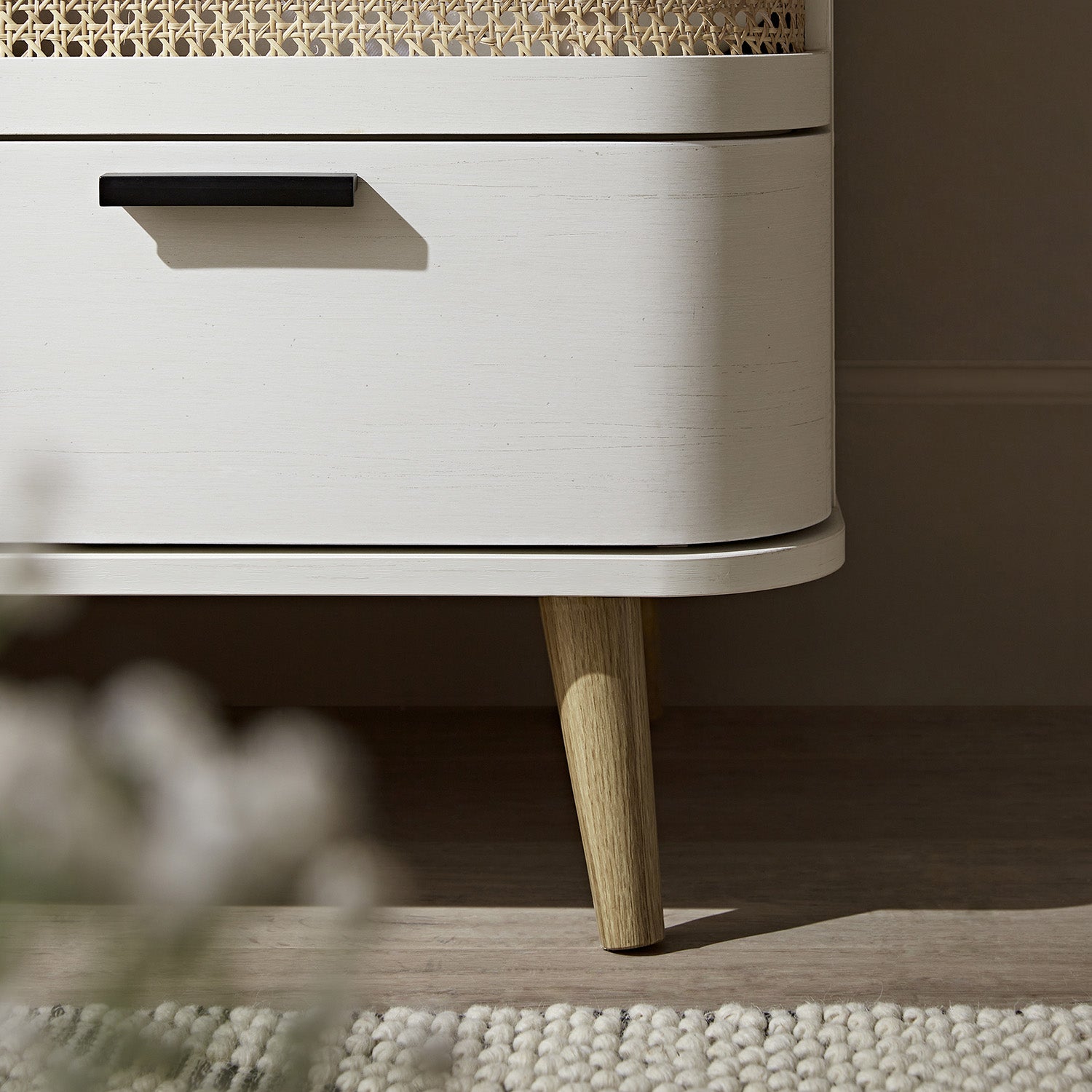 - Finished in a crisp white tone with a lightly distressed effect, designed intentionally for a lived-in charm, and paired with handwoven rattan panels, it creates a beautiful balance of texture and softness.