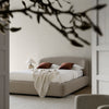 - Plushly padded from head to end, the bed is upholstered in beautiful textured boucle fabric in light taupe colour, including the back of headrest.