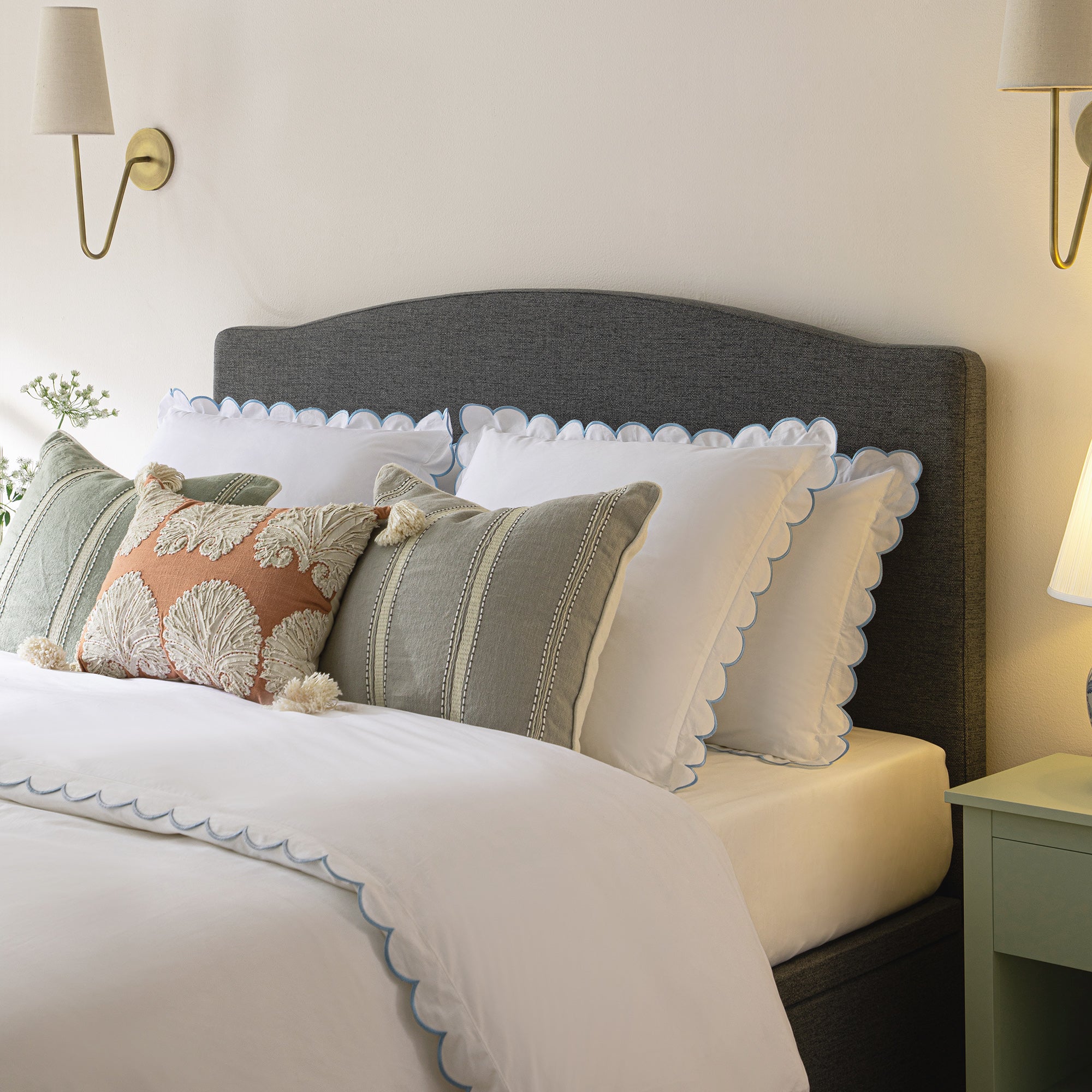 - The gently curved headboard adds just a hint of shape.