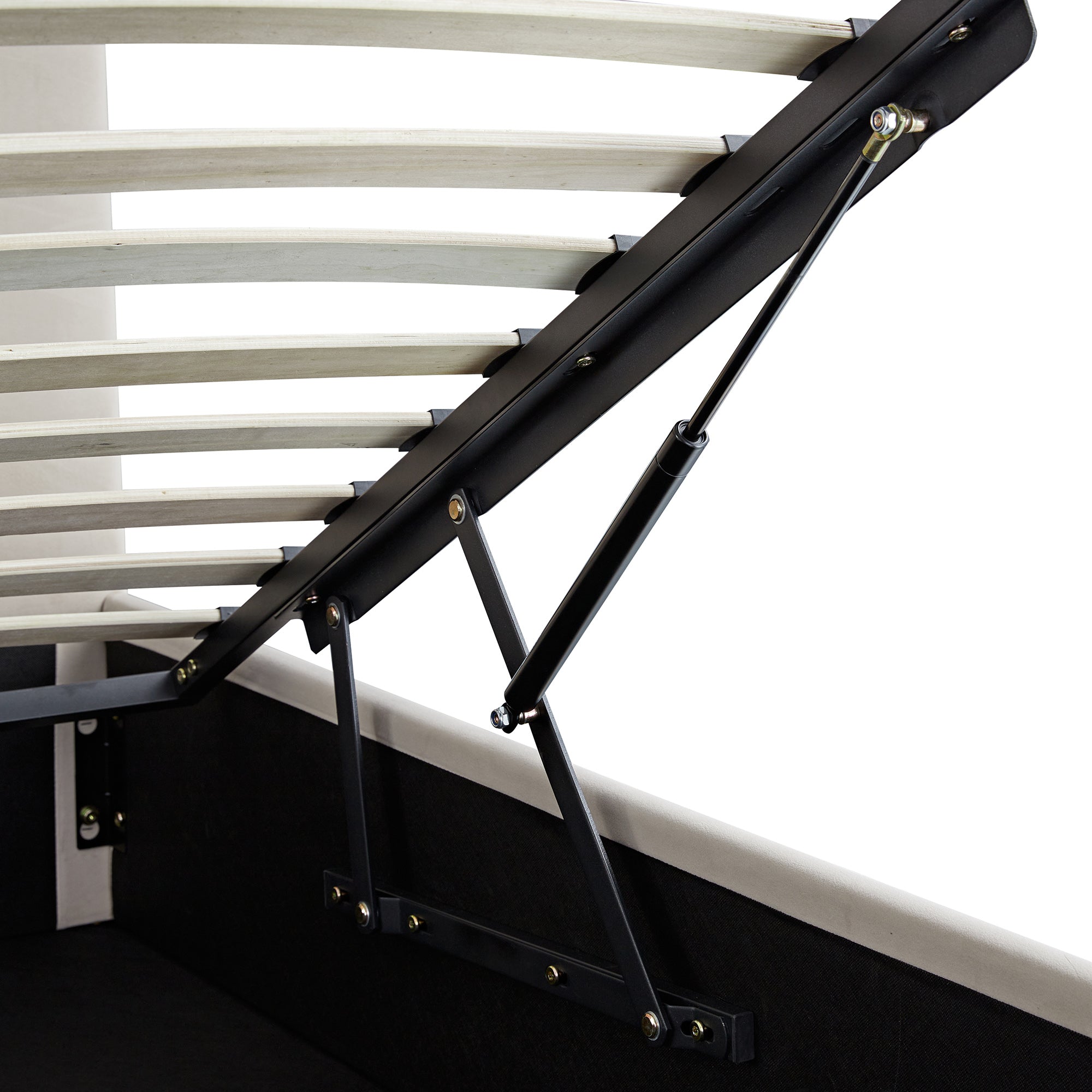 - The neatly upholstered base conceals an ottoman compartment, accessed from bed end with gas-lift mechanism, offering discreet storage.