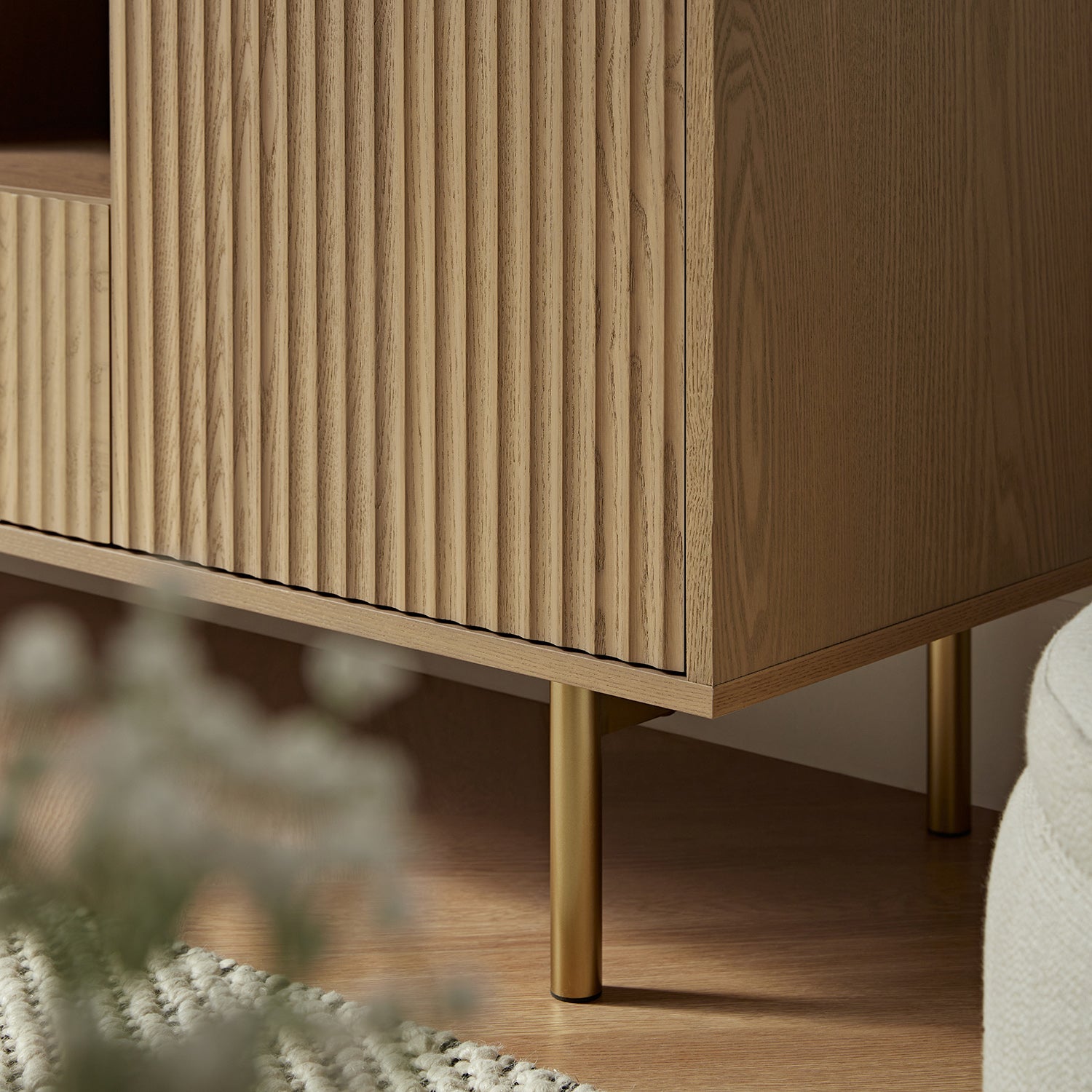 - The 47 inches wide TV unit features ribbed front finished in light stain, completed with contrasting gold effect handles and legs.