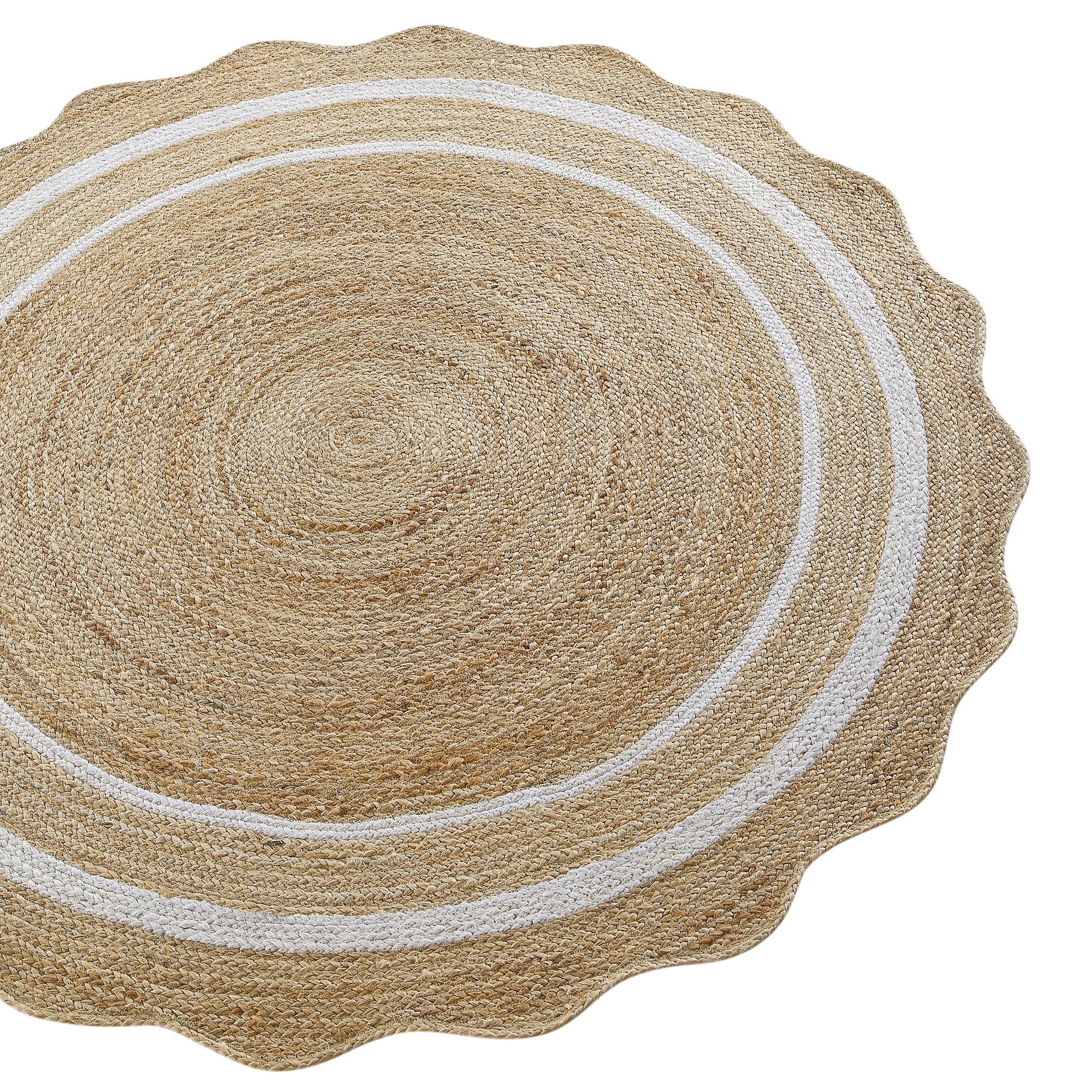 - Evie’s design incorporates a subtle spiral appearance towards the center of the rug. This is then complemented by the classic scalloped edge and a bleached double white border to add contrast to the natural jute