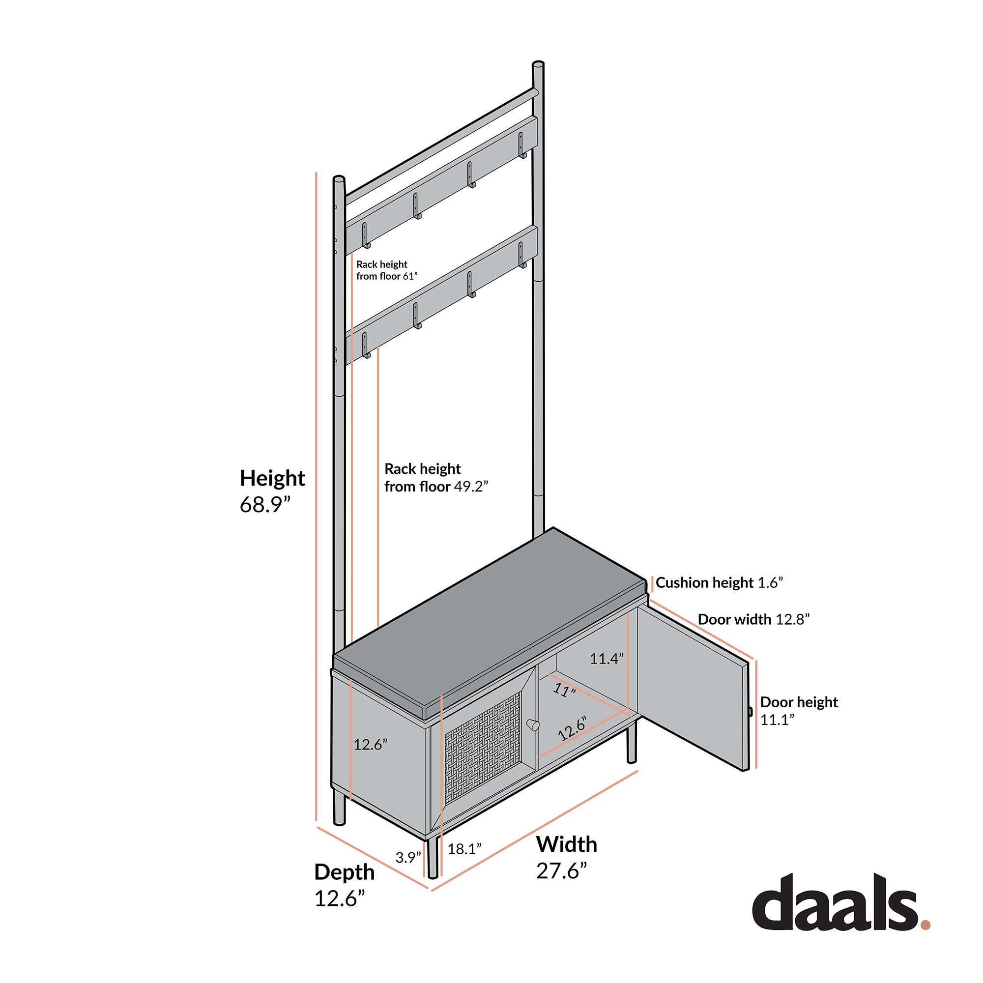 - Size: W 27.6 x D 12.6 x H 68.9 in.