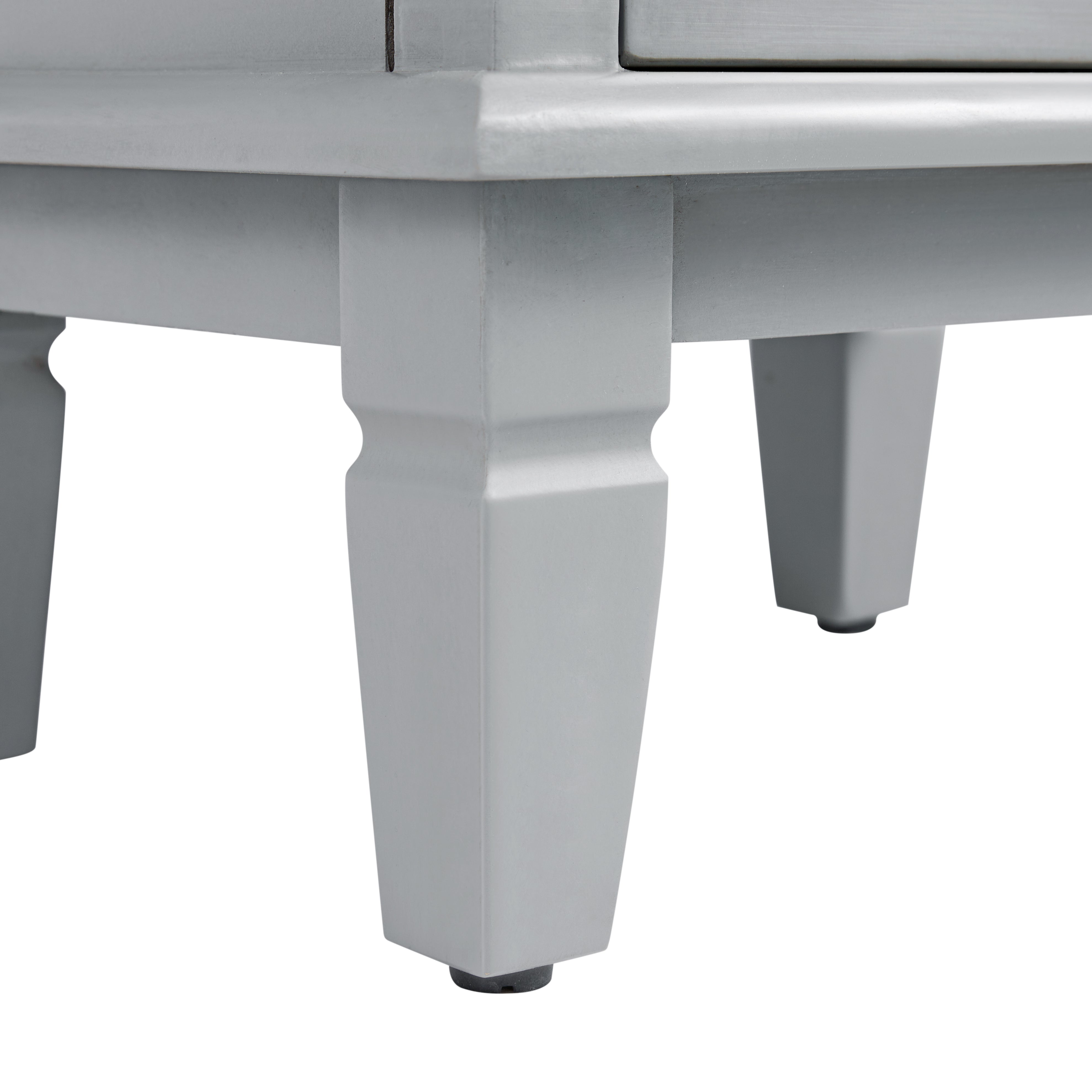 - A tall, elegant storage cabinet finished in mid gray, with intricate floral-carved detailing on both doors.