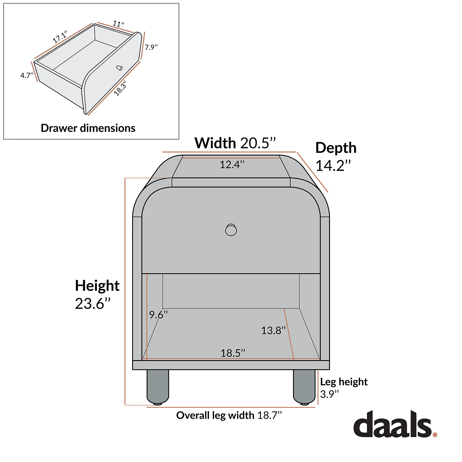- Drawer internal storage space: W 17.1 x H 4.7 x D 11 in.