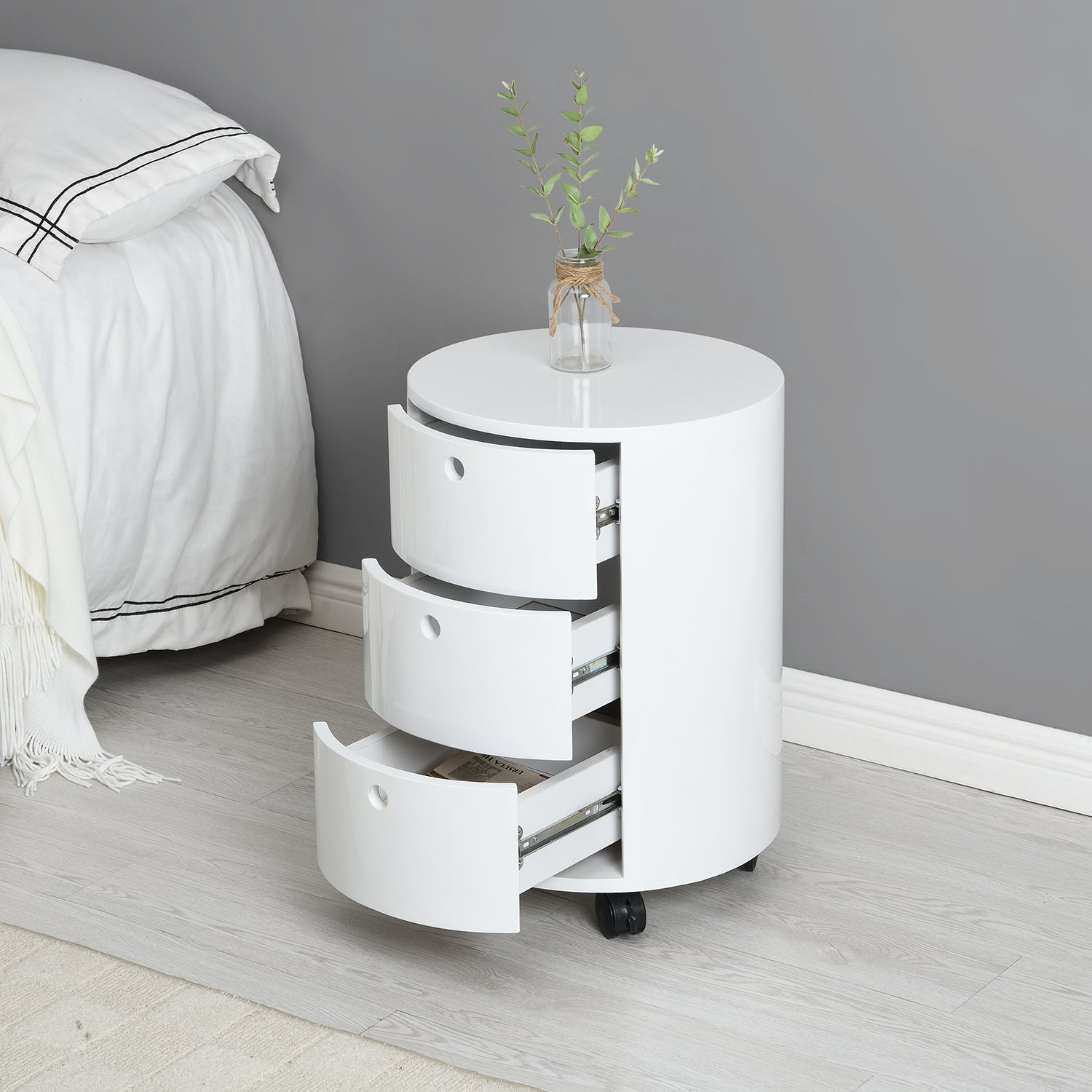 - The Dolio barrel nightstand are ideal for modern home decor. The sleek and curved design with sliding drawers and easy-to-move rollers makes it perfect beside sofa or your bed.