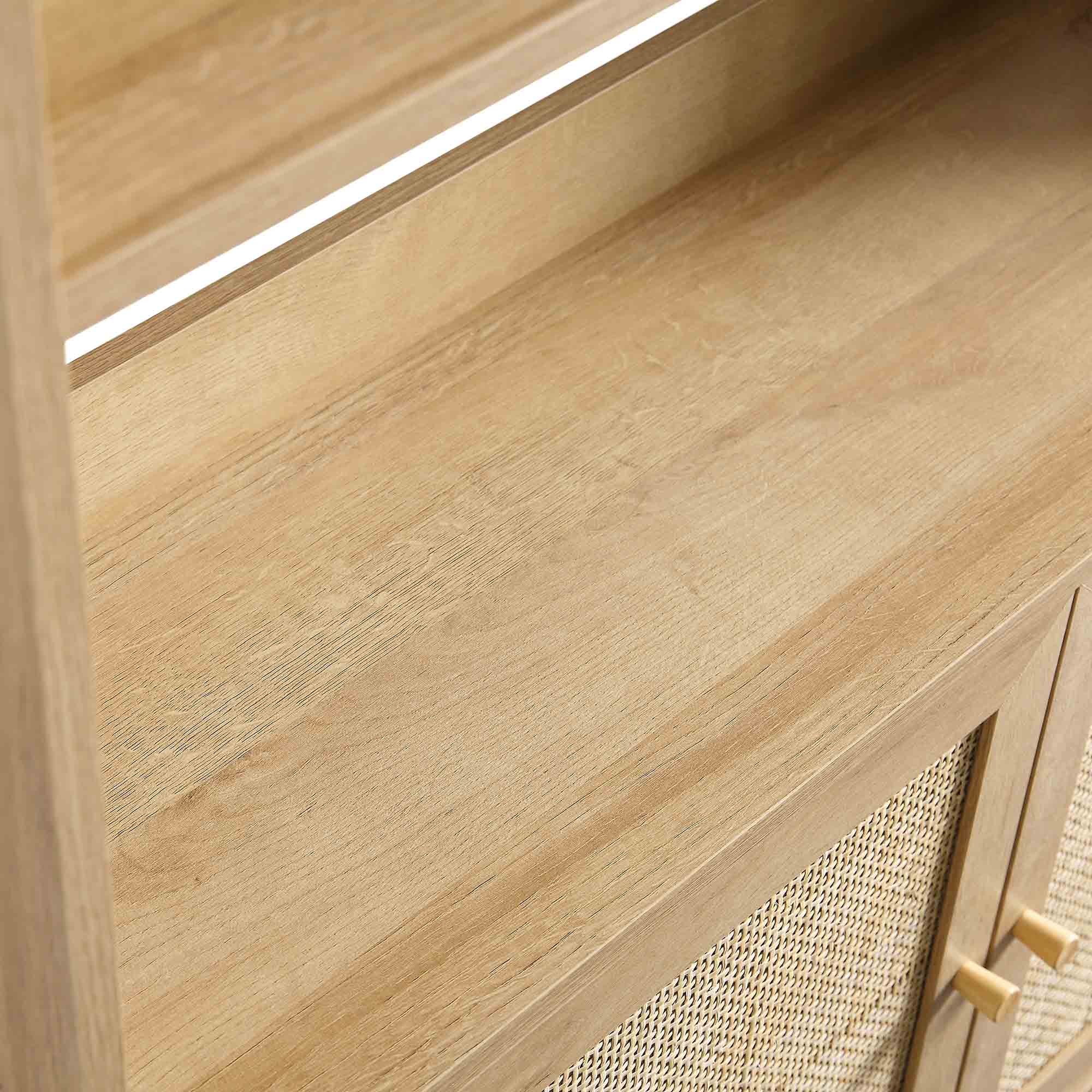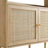 • Hand woven natural rattan inserts on the doors coordinate with solid wood door handles.
