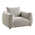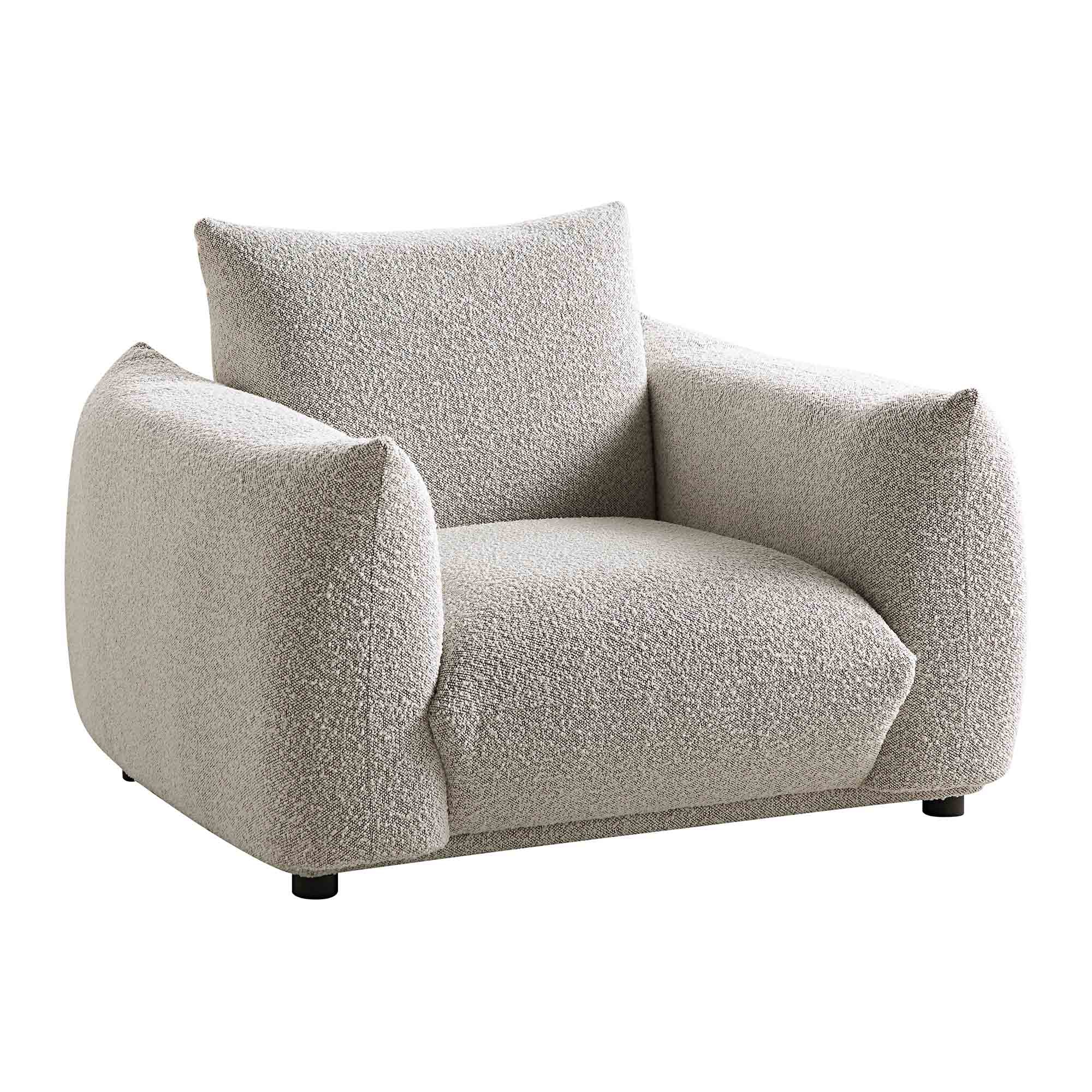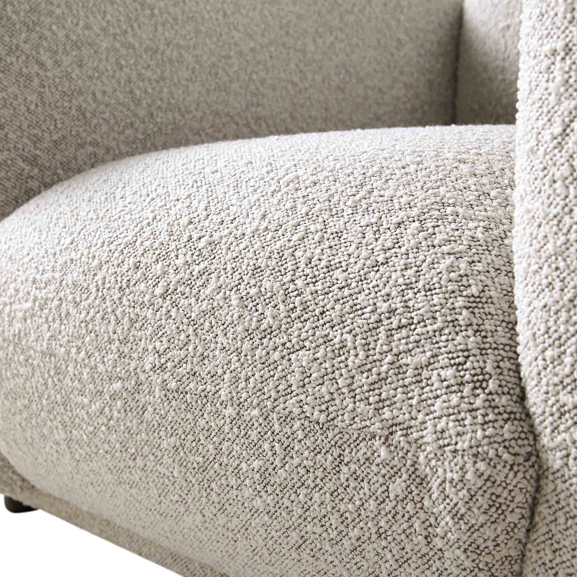 - Upholstered with chic mist gray boucle fabric for a contemporary look.