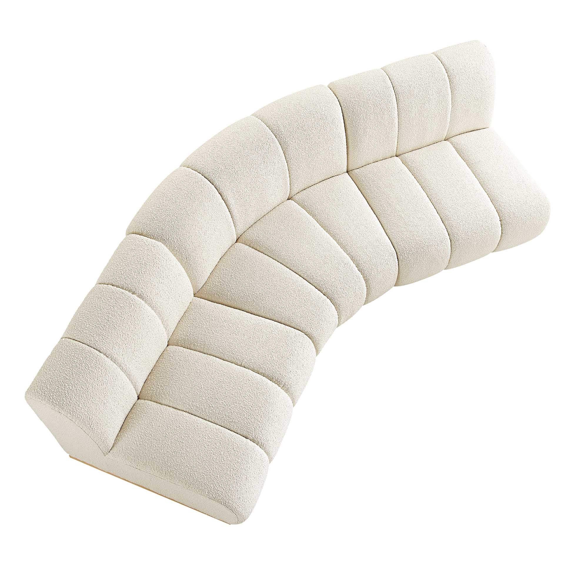 - Upholstered with beautiful ecru boucle fabric, the sofa sections are mounted on natural solid wood bases.