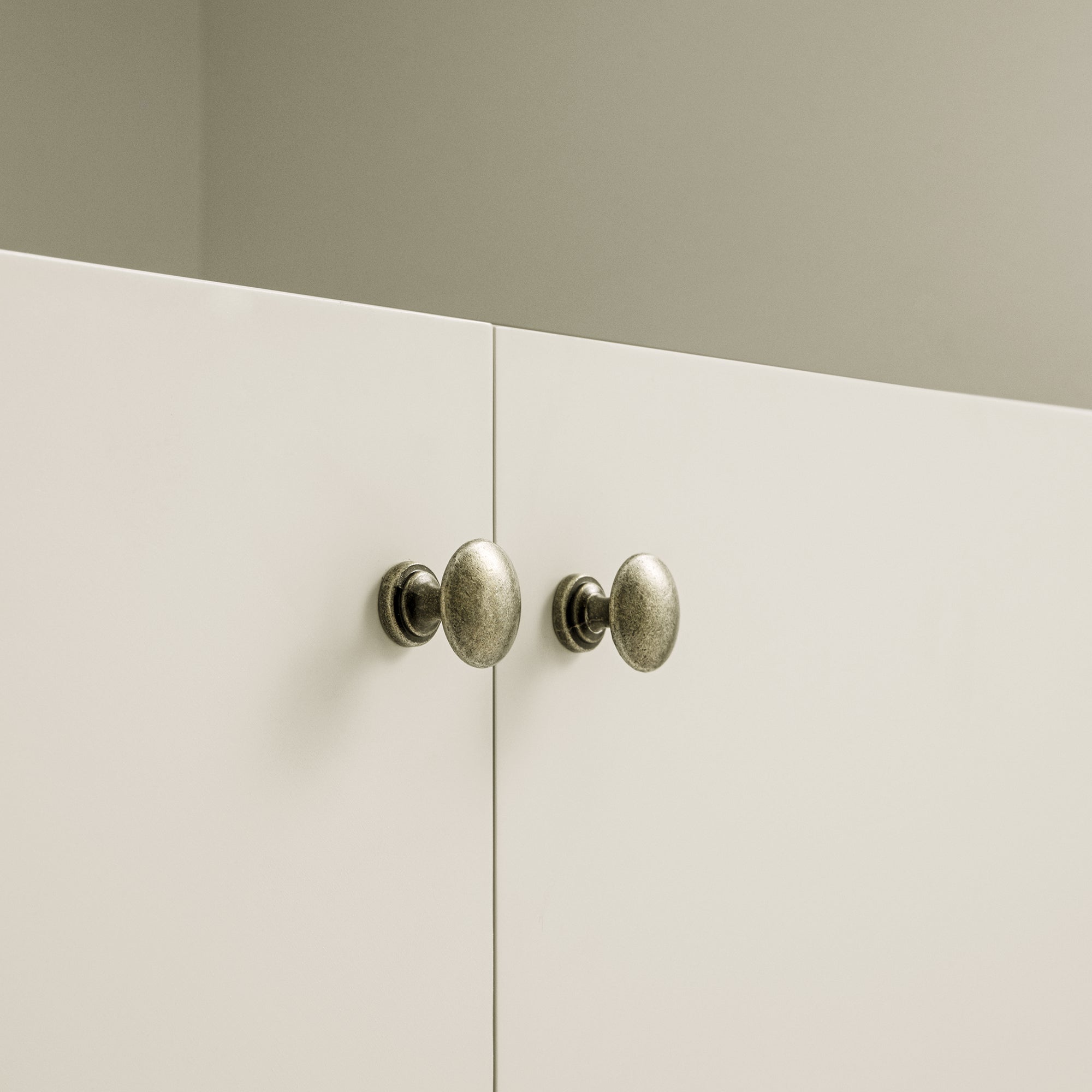- A scalloped apron on the bottom of doors adds to the charm of the sideboard.