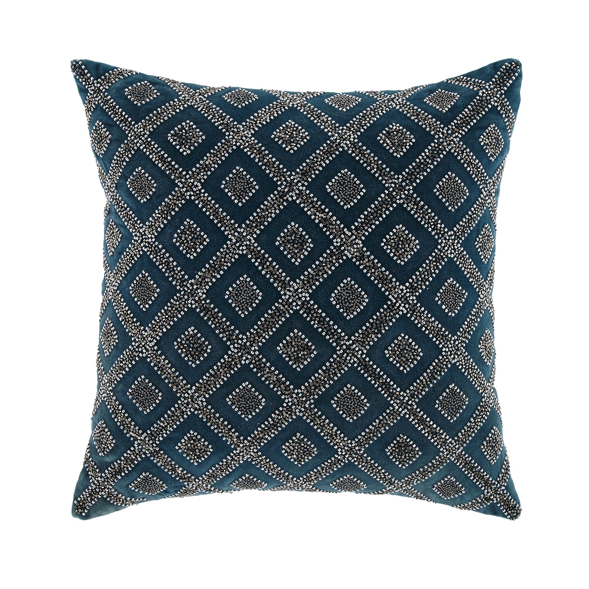 - Made from sumptuous teal blue Velvet and beautifully adorned with silver metallic beads, this pillow is the perfect solution for Glam décor.