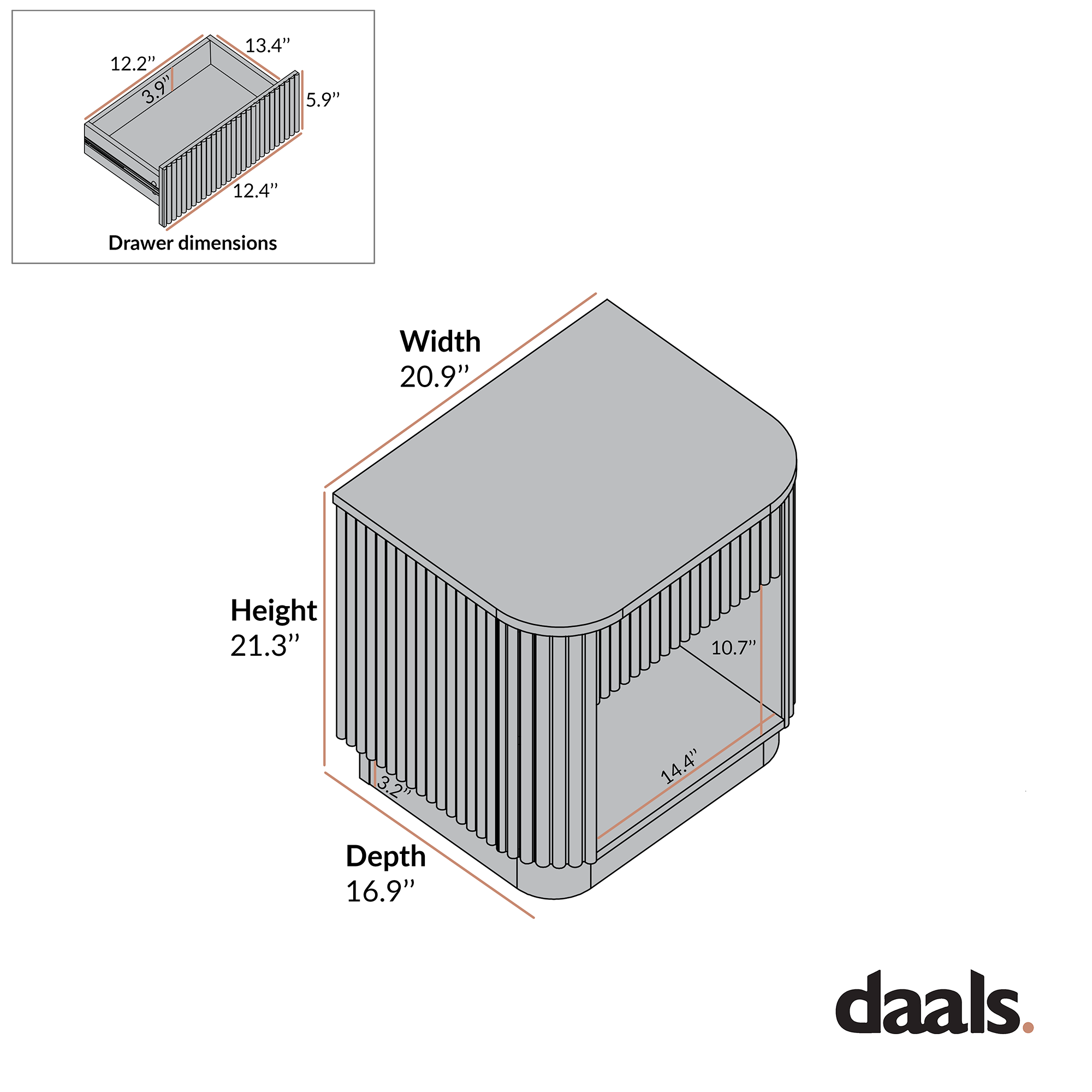 - The Nightstand features all solid oak flutes on 3 vertical surfaces, including the front and both sides, for a striking and balanced look.