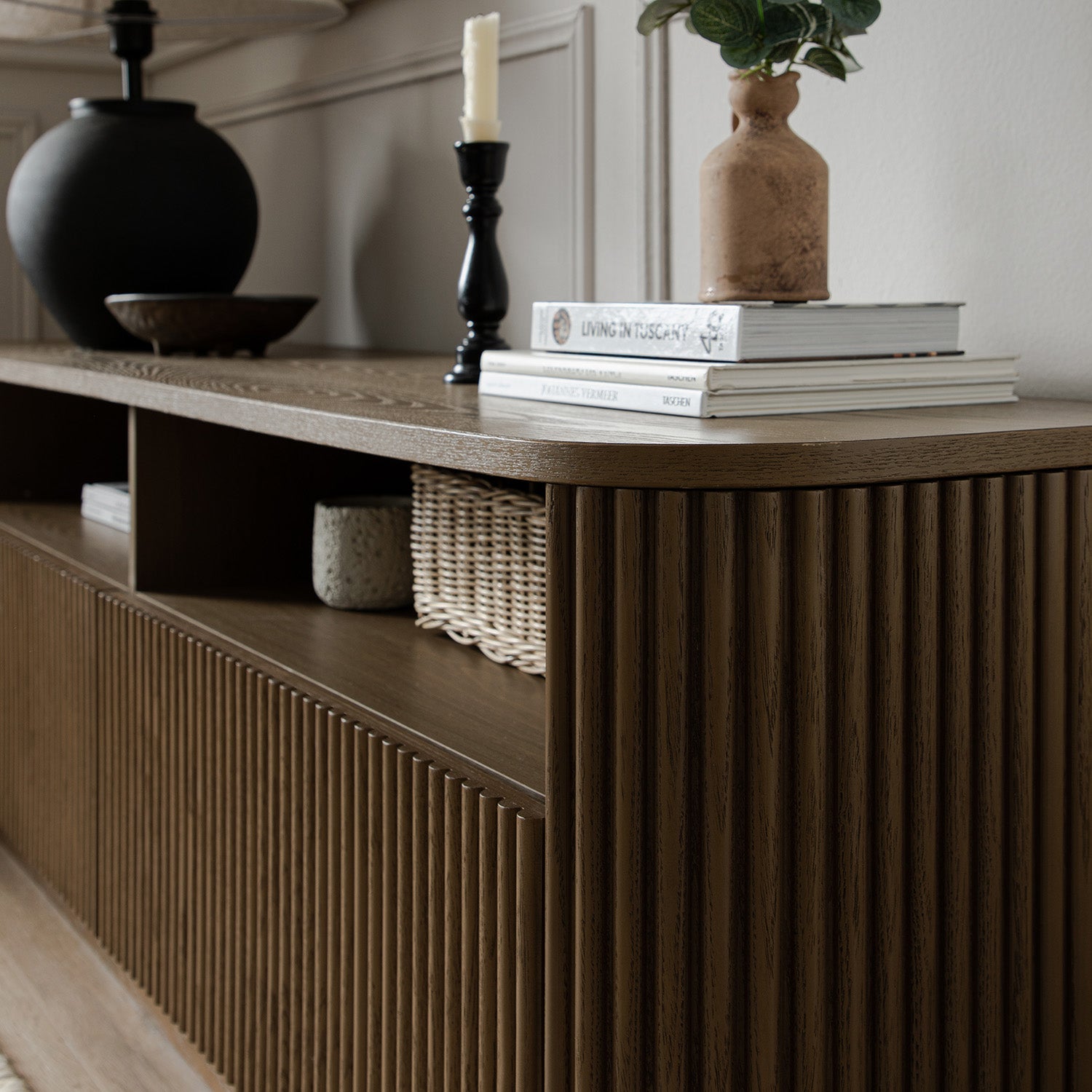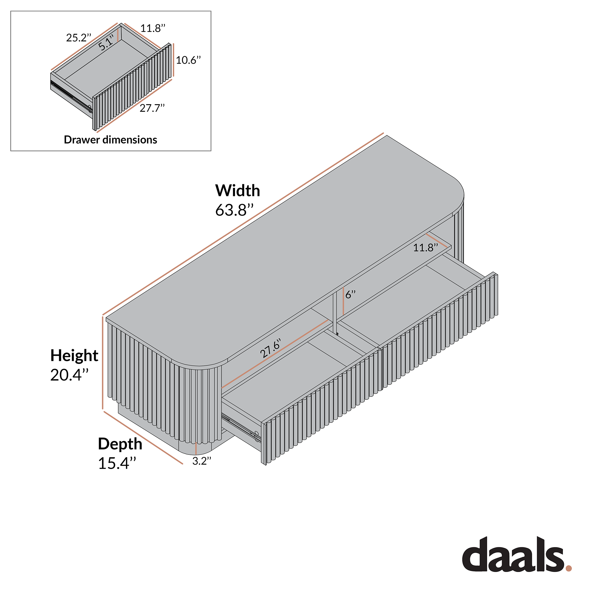 - At 64 inches wide, it is perfectly proportioned for medium to large televisions and works just as well as a low sideboard in calming, contemporary spaces.