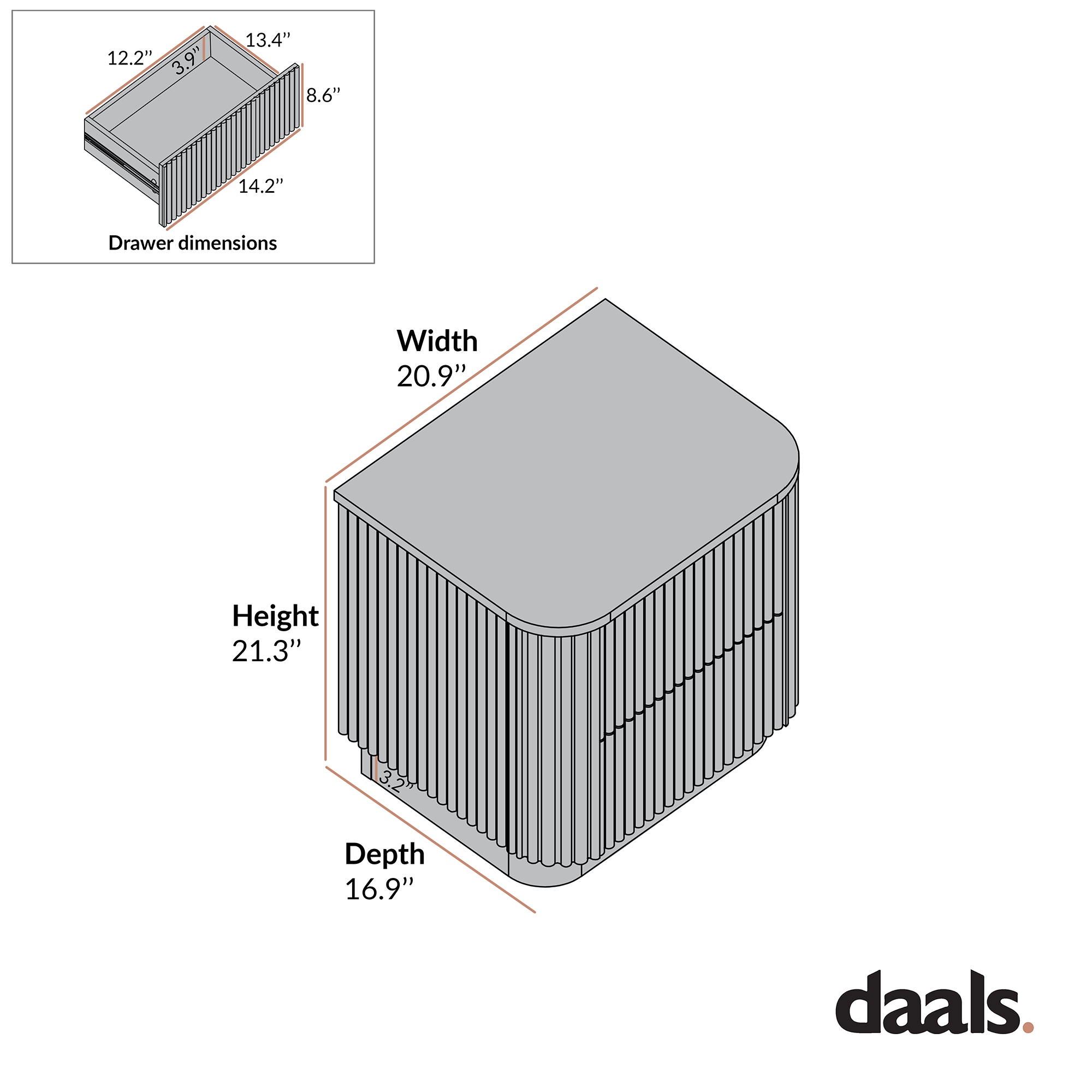 - The Nightstand features all solid oak flutes on 3 vertical surfaces, including the front and both sides, for a striking and balanced look.