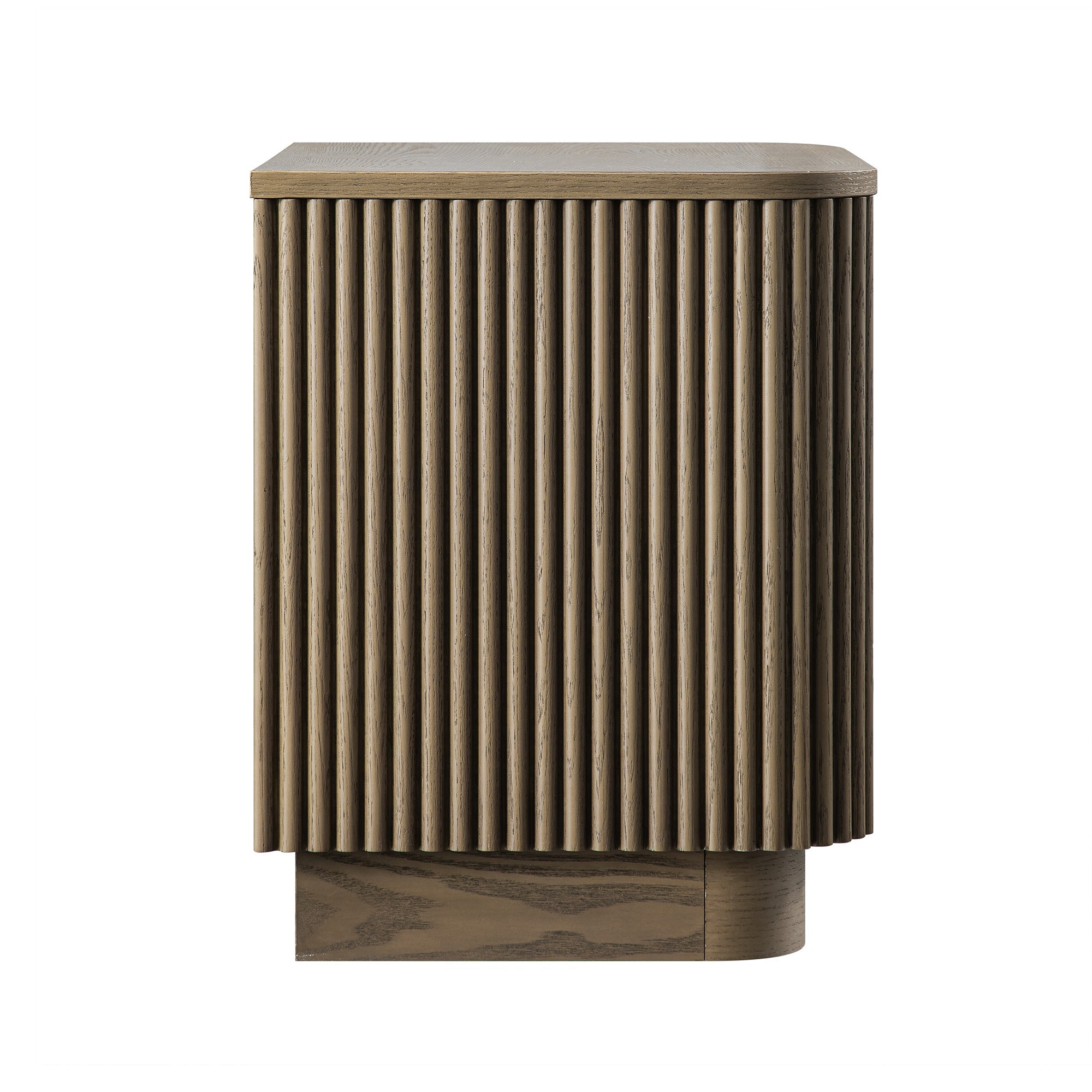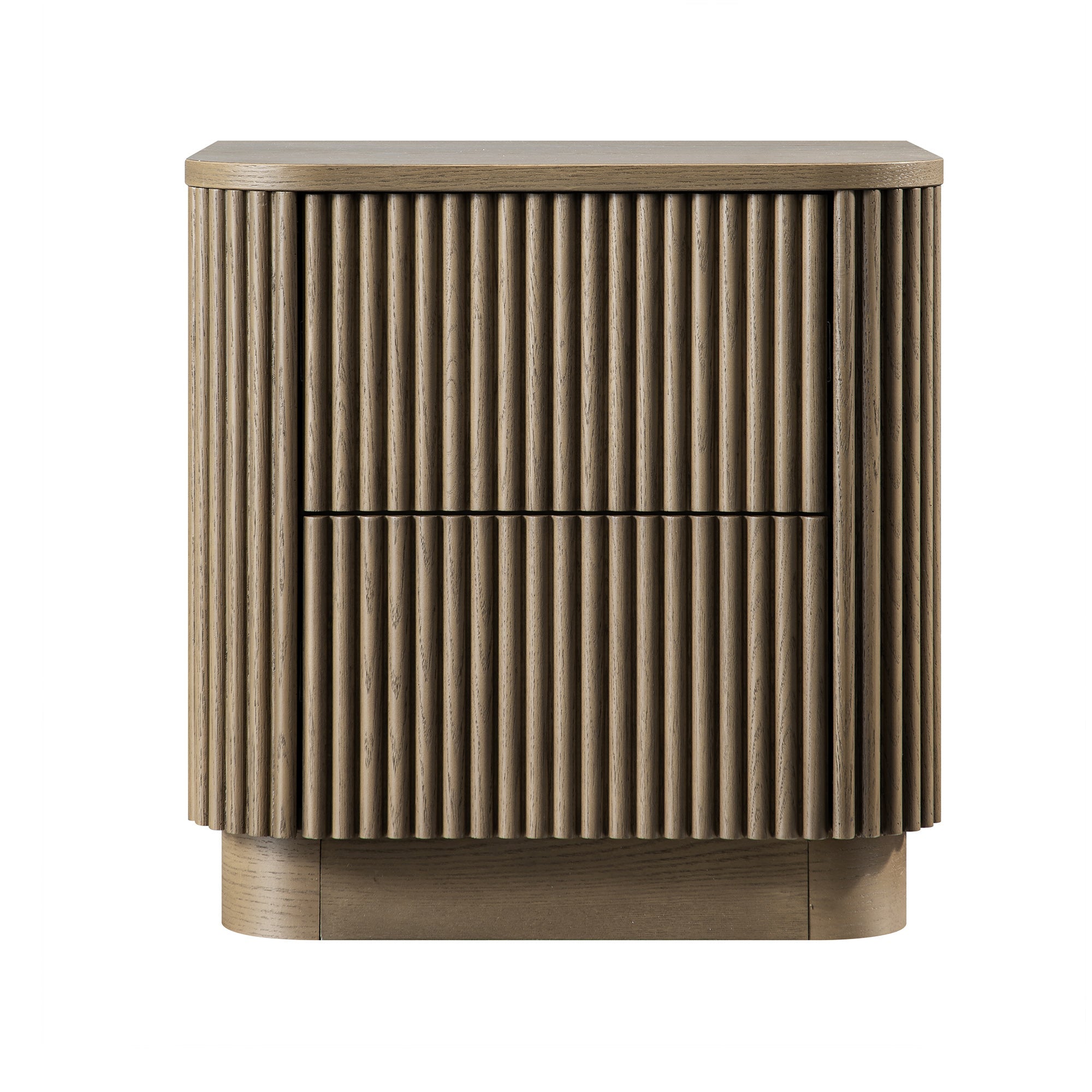 - The Nightstand features all solid oak flutes on 3 vertical surfaces, including the front and both sides, for a striking and balanced look.