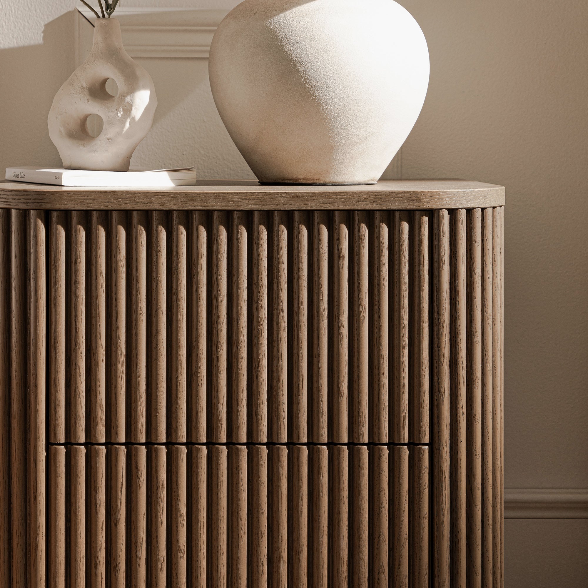 - Wrapped in a warm, solid silver oak veneer, its fluted detailing and softly curved corners echo the collection's signature language: elevated, tactile, and quietly expressive.