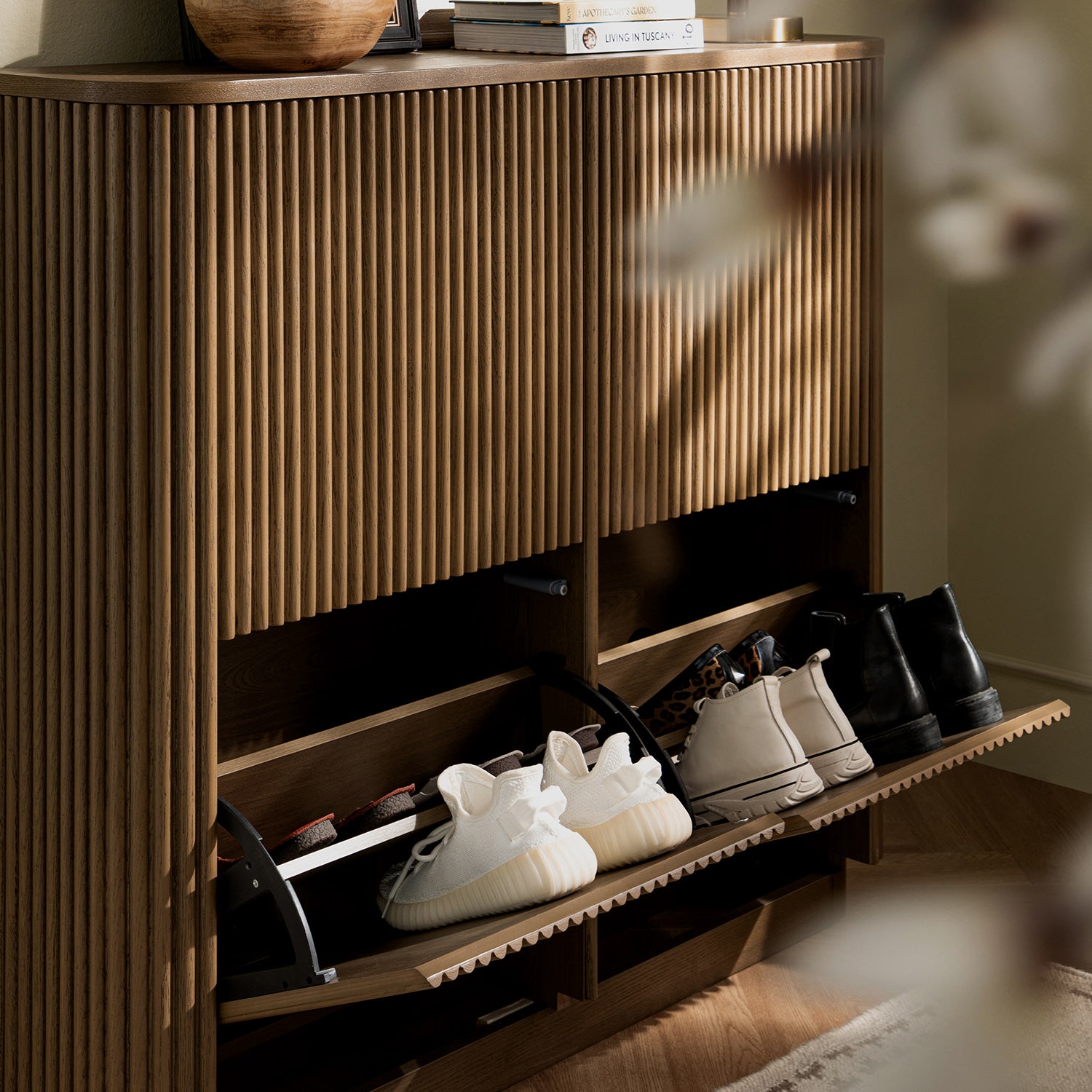- Crafted in solid ash and ash veneer, the Maru Shoe Cabinet in Silver Oak offers an elegant take on everyday utility.