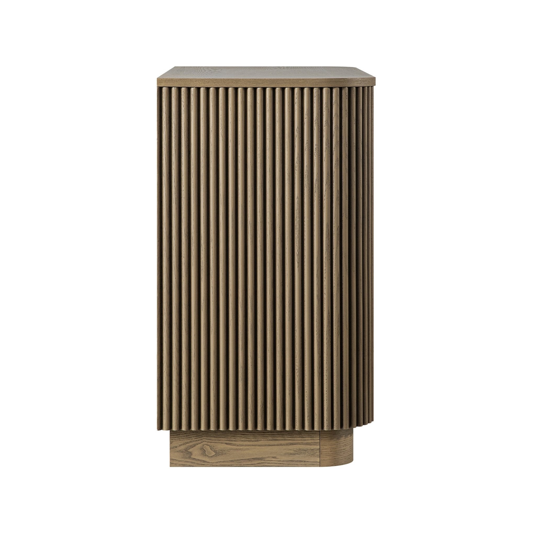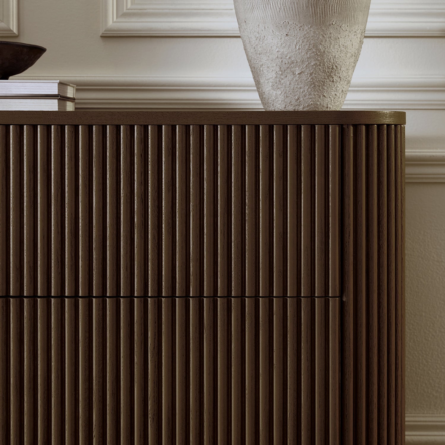 - The dresser is designed with all solid ash flutes on 3 vertical surfaces, including the front and both sides, for a well-rounded look.