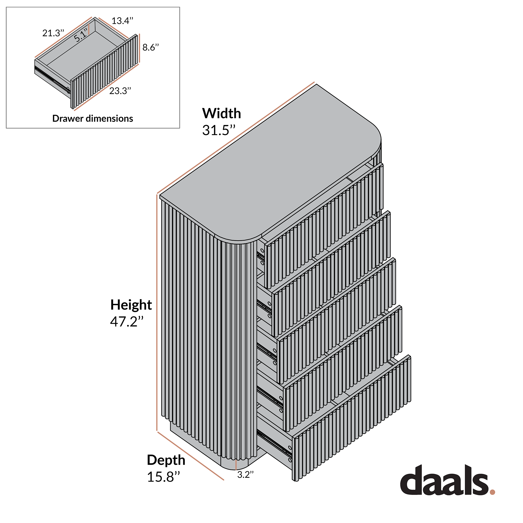 - Towering with quiet confidence, the Maru 5 Drawer Dresser in Oak distills the essence of the Maru collection into a tall, sculptural form, bringing generous vertical storage and refined presence to the bedroom.