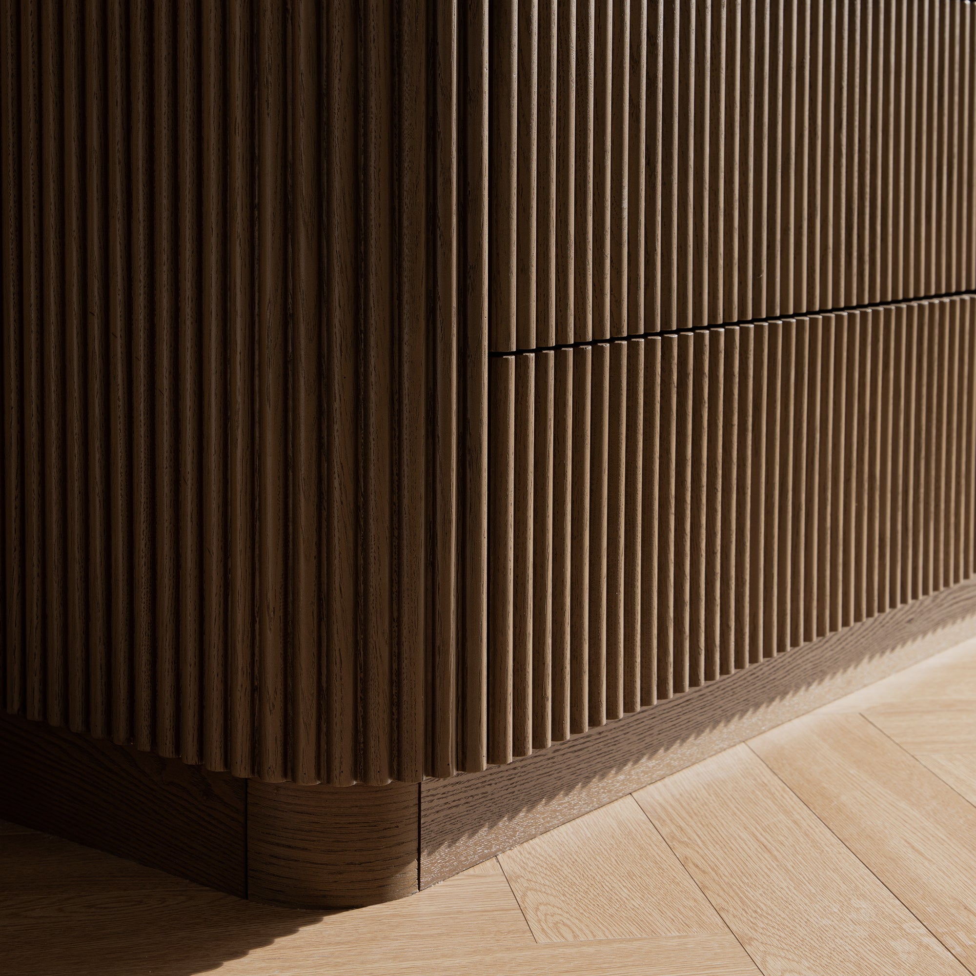 - Vertical fluting wraps the piece on front and both sides in subtle rhythm and texture, while the softly curved corners and recessed plinth base keep the profile grounded yet elegant.