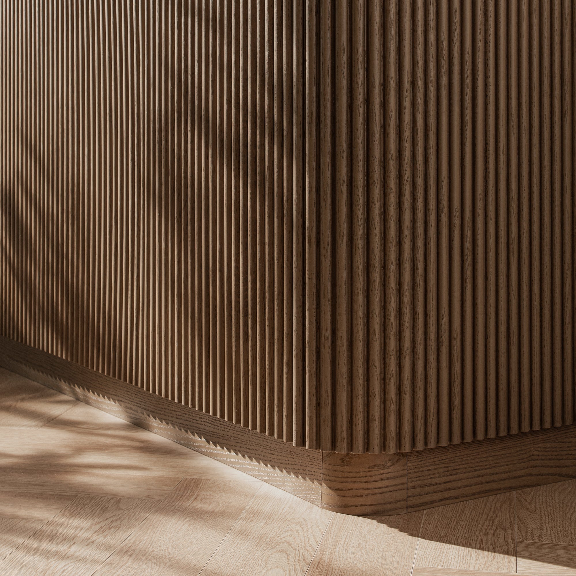 - The signature fluted facade flows seamlessly across four handle-less doors, framed by gently rounded corners and anchored by a recessed plinth base.