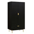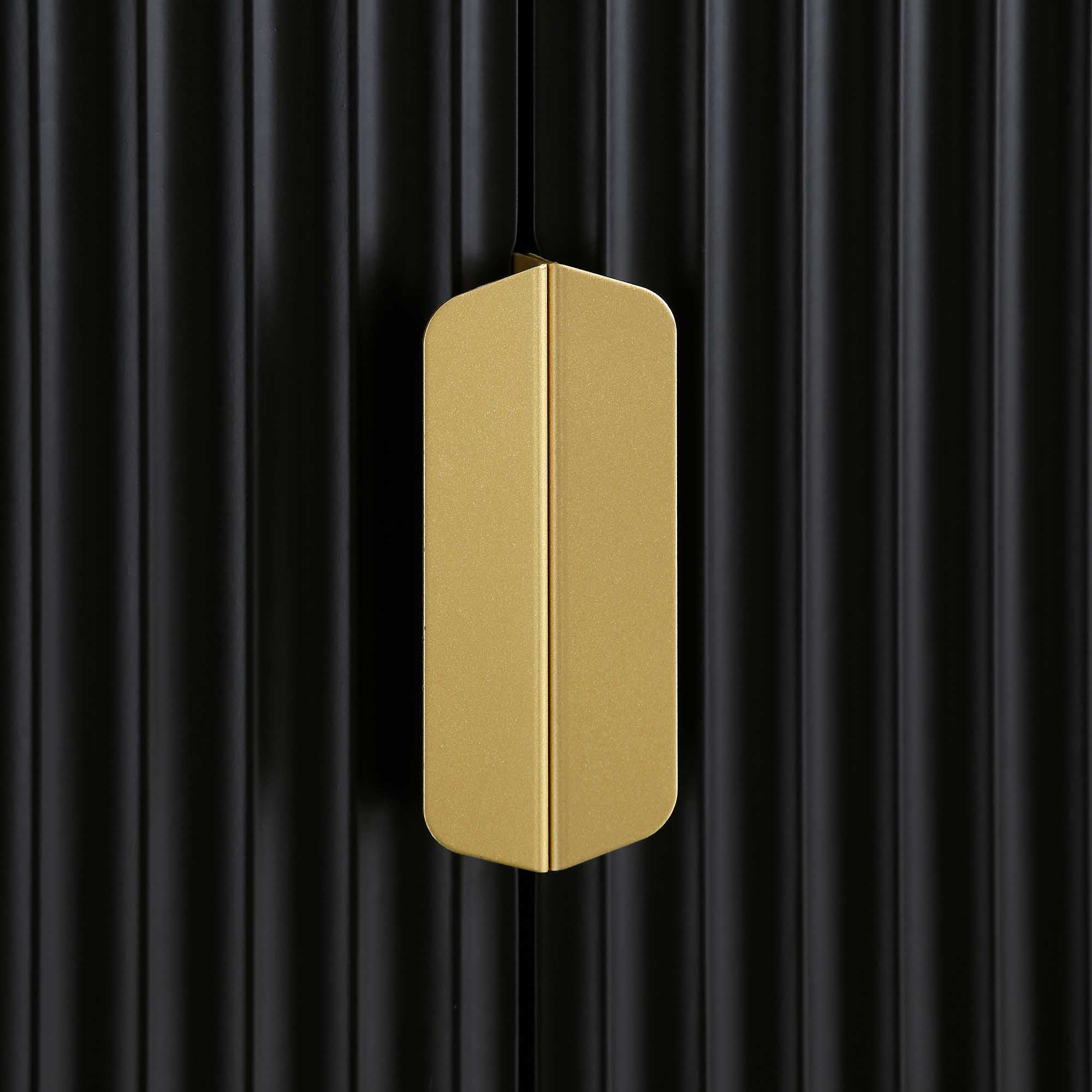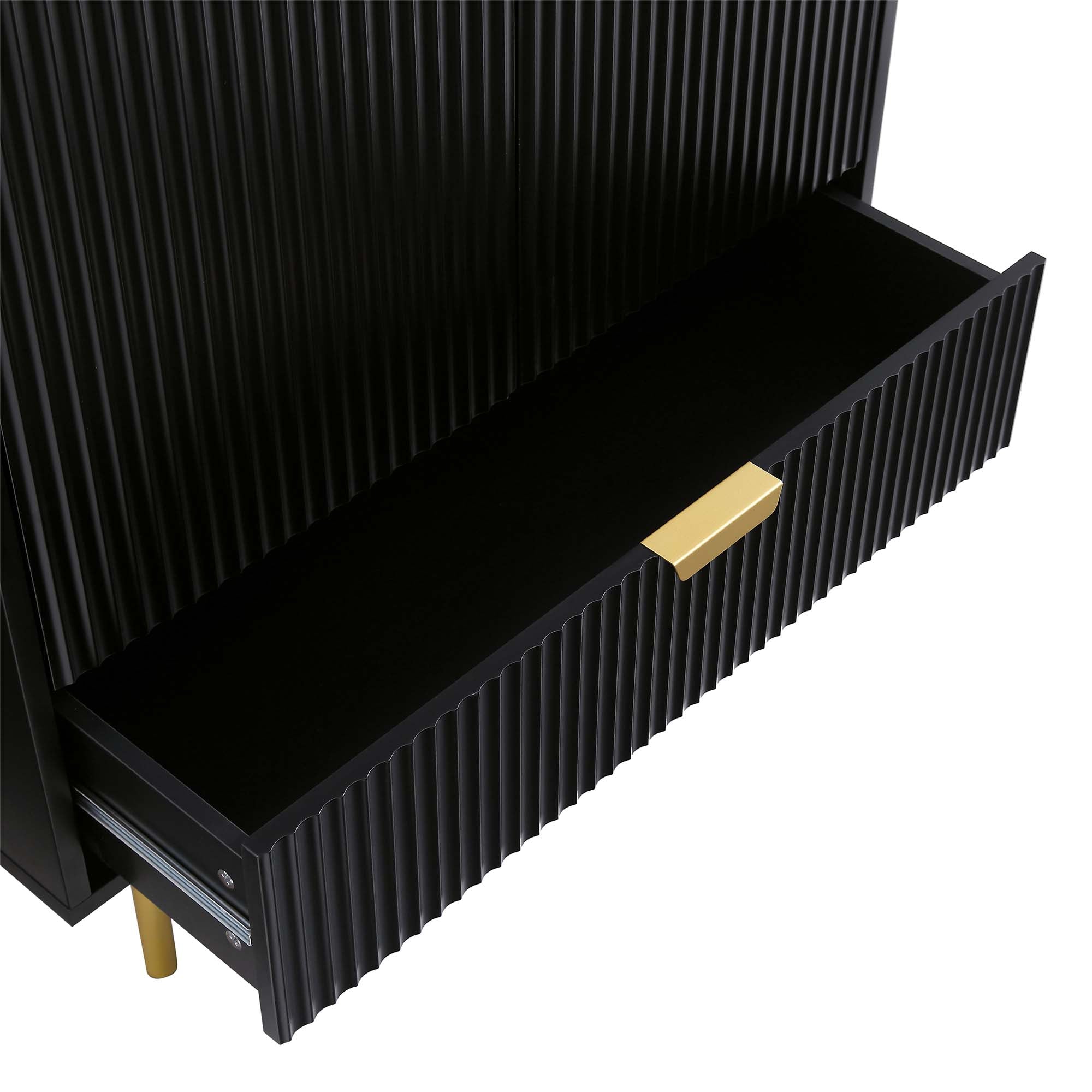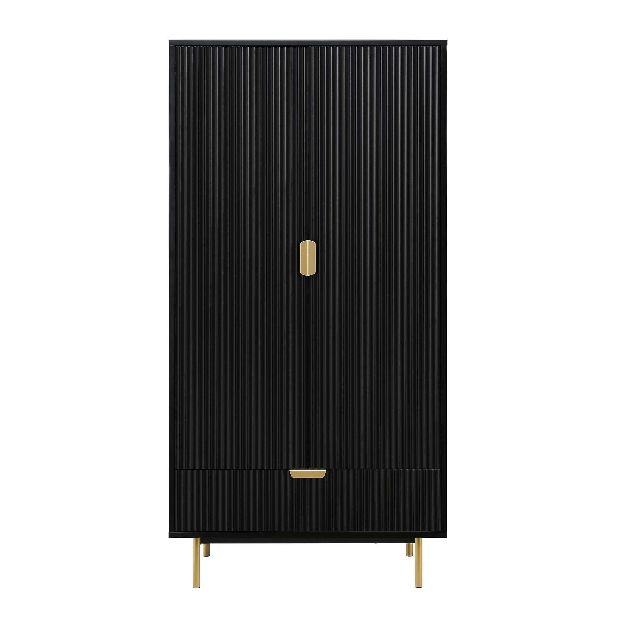The closet features stylish ridged doors and drawer front finished in matte black paint, paired with gold handles and legs.