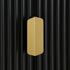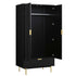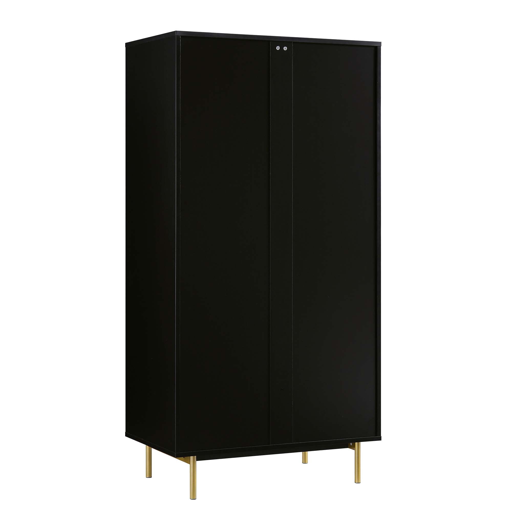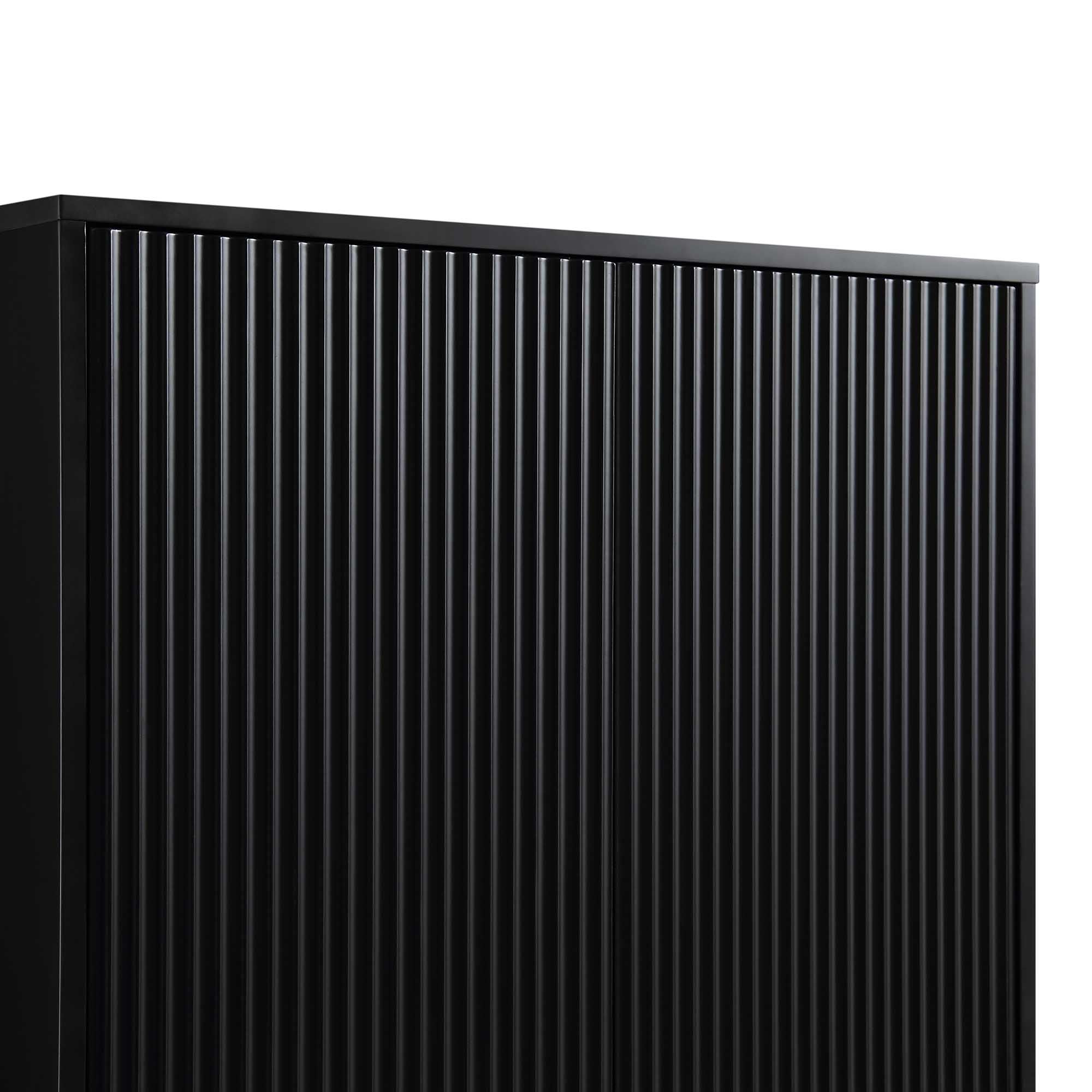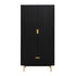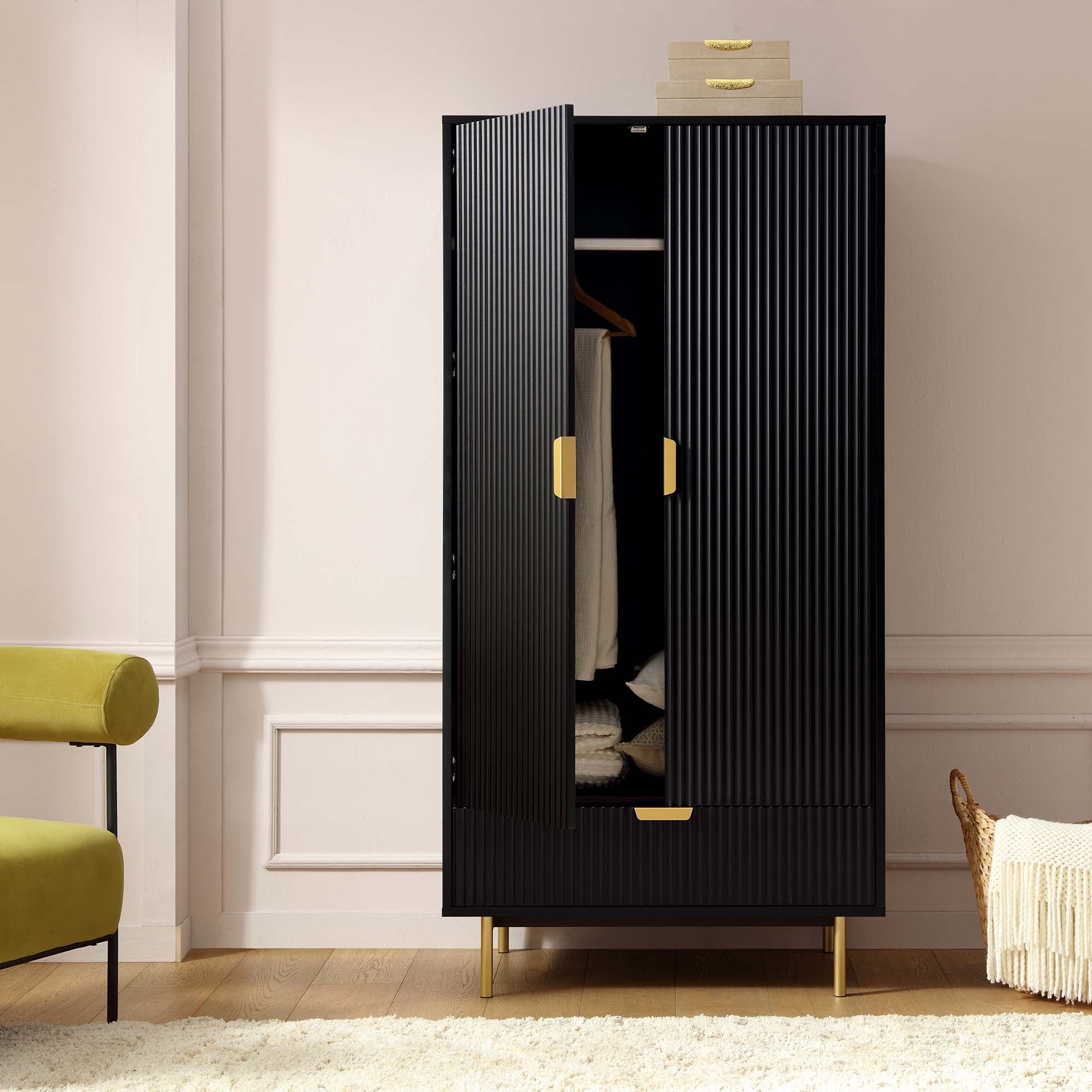 The closet features stylish ridged doors and drawer front finished in matte black paint, paired with gold handles and legs.