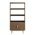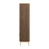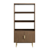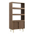 - The bookcase features a ridged door surface finished in dark shade stain, paired with gold handles on the doors and matching legs.