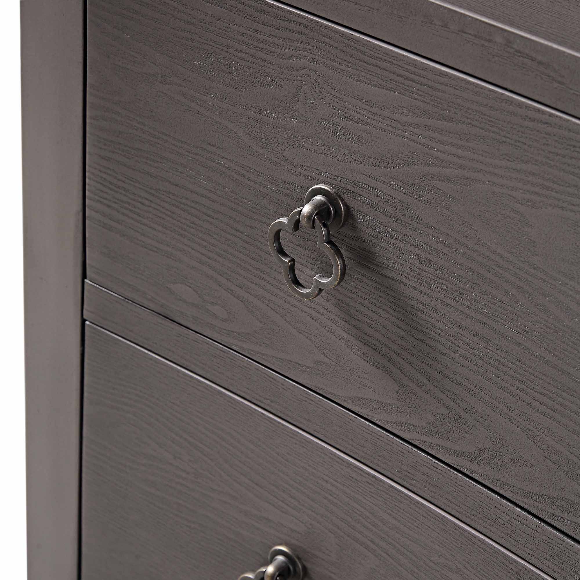 - Gently concave drawer fronts are complemented with the aged brass clove metal handles.