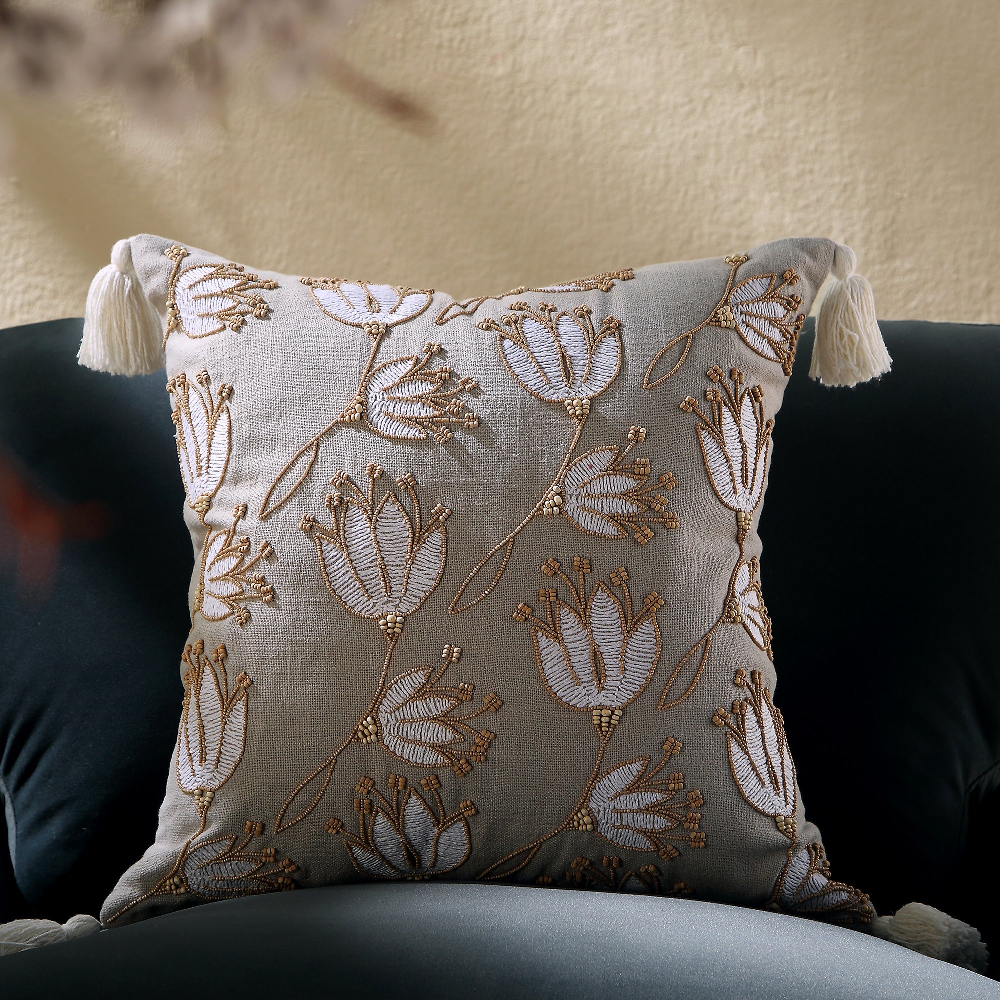 - Forming part of our vine collection, this pillow is sure to add a touch of nature to your home decor, with its beautiful floral design, featuring wooden beads, thick edge tassels and specialized couching stitches in thick cotton yarn,