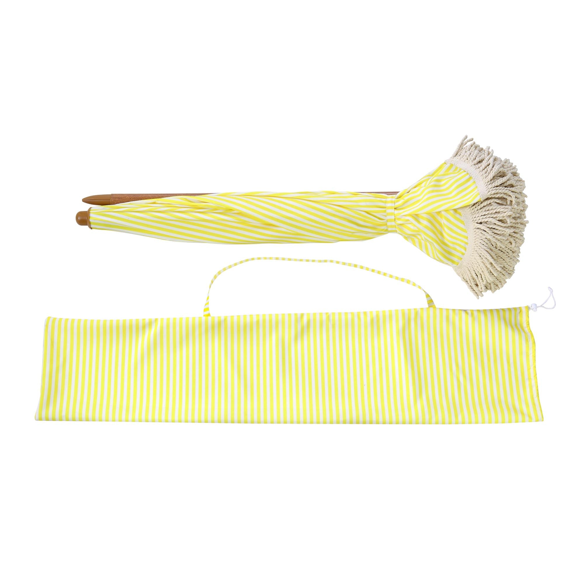 - Featuring blue and white stripe canopy with beige colour fringe, the parasol can tilt by adjustable pole hinge.